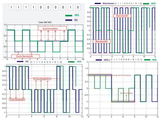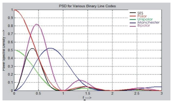 Equations (1)–(5) and (9) have been used to calculate PSD for various line codes. The graphical representation of results for multiple line codes and SES against PSD is shown in Figure 9. It seems that SES utilizes PSD better than the other digital-to-digital encoding schemes. This is because SES does not modulate the signal repeatedly, due to the forwarding of a shadow copy of the same bitstream without performing modulation.