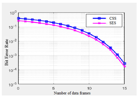 Figure 12 presents the bit error rates between SES and CSS. It has been observed that, as the number of data frames increases in the network, the bit error rate increases. The results show that SES modulation performs better than the CSS modulation technique. The bit error rate is calculated based on audio, video, and text messages. The SES provides support to modulate three formats (audio, video, and text messages) of data, but, on the other hand, CSS is purely designed for text messages for IoT communication.