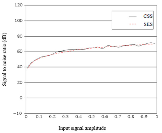 Figure 13 illustrates the difference in SNR between SES and CSS. It seems that there are few variations in SNR as the amplitude of the input signal increases. Similar modulation behaviors can be observed for SES and CSS in the calculation of SNR. When the modulators are in the stable region of operation, we observed a close match of the approximated SNR results during the simulation between SES and CSS.