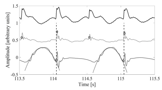 Visualization of the heel-strikes detected based on concurrently recorded ground reaction forces (vertical ground reaction—force black solid line), waist-worn inertial measurement unit (IMU) vertical acceleration (lightest grey solid line) and waist-worn IMU sagittal plane angular velocity (dark grey solid line). Dashed black vertical line indicates right foot heel-strike based on ground reaction forces. Black square indicates heel-strike based on the waist-worn IMU. Black circle indicates heel-strike based on the ankle-worn IMU recording. Dotted gray line shows the fitted parabola used to define heel-strike events based on the ankle-worn IMU recording.