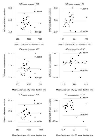 Bland-Altman plots of stride duration and stride duration variability assessed a week apart with a force plate and a wait-worn and ankle-worn inertial measurement unit (IMU). ICC = intra-class correlation coefficient.