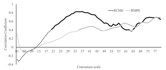 Correlation analyses between the waist-worn IMU multiscale entropy analyses and force plate-based stride duration variability indicated a significant positive association between the two for RCME from scale 20 upwards (except scale 64) (r = 0.40–0.83; p < 0.05) and for RMPE from scale 35 upwards (except scale 49) (r = 0.38 to 0.69; p < 0.05) (Figure 3).