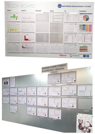 - Balanced Scorecard is a SM system first described by Kaplan et al. [44] in 1992. The prime goal is to enable a balanced view on the driving measures of a business. This works by showing a handful of measurements that allow managers to interpret the complex interactions. Every measurement receives a specific target to motivate the employees to achieve this state. This is in contrast to more traditional approaches. A focus was only set on a few financial performance numbers. These only give a very short-sighted glance on the actual competitiveness of a company.One example of a balanced scorecard implementation is visible in Figure 2a showing the measures of Safety, Quality, Delivery and Value (SQDV). There are many variants in circulation such as Safety, Quality, Delivery and Customer (SQDC) or Quality, Delivery, Inventory, and Productivity (QDIP) that can also show the priorities of a company by including or excluding specific categories such as Environment or Safety.Neely describes the standard way of using BSC [46] through the following steps: