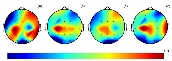 - Image generationThrough the MNE library [79,80], these time segments are transformed into topographic maps, as shown in Figure 6. The topographic map displays the activity in the brain, using distinct color tones for the different strengths. To show the brain activity for the complete brain and not just the measured points, the points in between the sensors are interpolated, creating a topographic map for the complete brain. Using more sensors would increase the accuracy of the interpolated area.In the example Figure 6 four topographic maps are visible. These show the average brain activity in the first 0.5 s for the four different categories.The values of the 0.5 s segments stretch to the smallest and largest value, displaying the relative differences on the brain using the jet color map as shown in Figure 6e. This was chosen as the full range of colors is used and the color range does not need to be optimized for the human perception as this color range is not intuitive for a human [81]. The lowest values are shown as a dark blue, which turn to a green and then to a dark red with the highest value.The images have a size of 360 × 360 × 3 pixel. A different size could have been chosen. Smaller images could decrease the accuracy and larger images would increase the training time.
