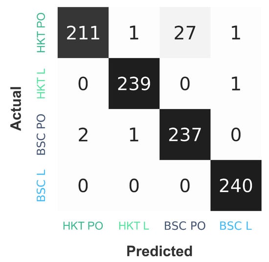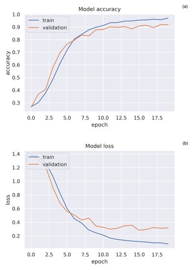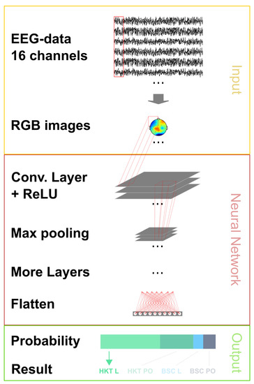- Deep Learning ArchitectureWith these generated images, a neural network can be trained. In this paper a convolutional neural network [82] is used. It has shown astonishing results within the realm of image classification [83,84,85] and is by far the most adopted neural network for physiological signal data processing while also showing excellent results [86]. By using it, a manual feature engineering is unnecessary. In the training phase, the neural network finds the most important features. These become more complex in each convolutional layer.Still, some specifications are set manually. These form the architecture. The coarse architecture of the used neural network can be seen in Figure 7, the exact composition and the code in the Open Access Repository. Parameters that are set include among others the number and the type of layers and the optimizer for the training of the neural network. Here we have chosen the Adam optimizer for the training of the network which stands for adaptive moment estimation [87]. The network architecture comprises four repeated layer groups consisting of a convolution, followed by a rectified linear unit (ReLU) activation and a max pooling layer. After this, the network is flattened and a regular, deeply connected neural network layer follows. To reduce the chance of over-fitting a dropout layer with a ratio of 0.2 is added. The network ends with four outputs that go through the Softmax function to display the probability of the four examined categories.While statistical ways exist to help select some parameters [88,89] and few have become unofficial standards, no clear-cut way to know the best beforehand exist yet. Thus, it is an iterative process of finding the ideal specifications for the architecture by starting with a simple design and seeing which changes improve the results. The final optimal layout therefore depends on multiple factors. More complex features that have to be found in general increase the number of layers needed [90]. But these can also be limited because the training data wouldn’t be sufficient for the increasing number of weights or a limit is reached solely because the hardware requirements can’t be met.