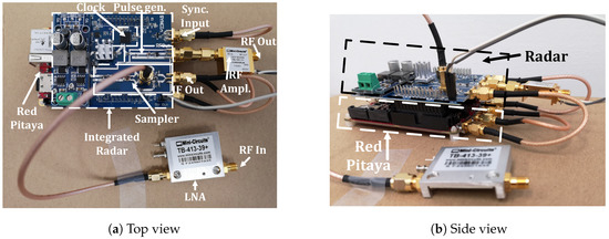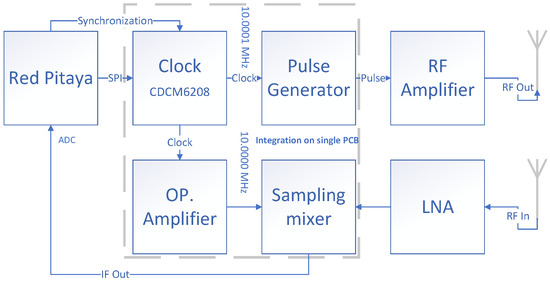 Figure 1. A pulse-based radar consists of two main parts: (i) a pico-second pulse generator, and (ii) a receiving part (sampling mixer) which captures the impulse response signal. The common clock generator distribution system is used to synchronize transmitter and receiver. The sampler requires an amplified clock using an operational amplifier. A Red Pitaya is used for on board signal processing, radar manipulation, and data transmitting to host the computer using the TCP/IP protocol. A detailed explanation of each block in