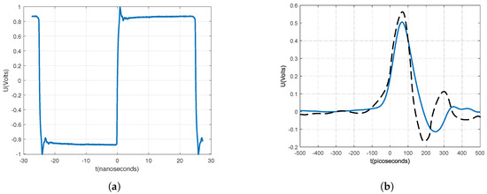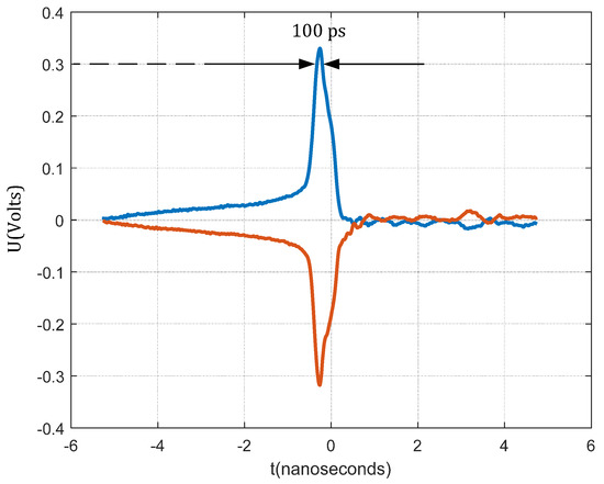 24], produced a pulse with an amplitude of approximately 1.2 V. This pulse was then divided into two pulses with opposite polarities using the balun. We chose an SMD-fabricated balun manufactured by the Mini-Circuit company (Brooklyn, NY, USA). A positive pulse opens the upper diode and a negative pulse opens the lower diode, according to