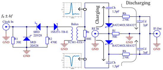17] used an additional negative supply voltage. Instead of this negative supply voltage, we used a precise clock generator with symmetric ±0.5 V amplitude, and 500 ps rise time. The PIN diode on input was also removed, due to this simplification. The PIN diode in the original research was used for blocking negative input voltage. SR diodes were biased with an adjustable negative supply voltage in order to push SRDs into a reverse regime.