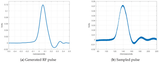 Figure 10. Generated RF pulses were measured using an Agilent 40 GSa/s oscilloscope, meanwhile the IF (Intermediate Frequency) output of the sampler was measured using a Rigol 2 GSa/s oscilloscope. We can observe in