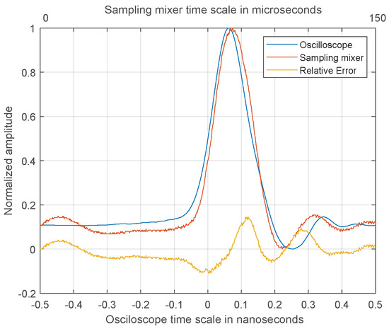 Figure 11 are both signals (from oscilloscope and sampler), normalized and scaled. From the signals, the relative error was calculated using the equation: