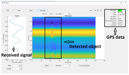 Figure 13. A user can set the IP address of the radar, start and stop signal capturing, put a visible marker on a B-scan, save all capturing data for further processing, and set the vertical offset of the signal, and so forth.