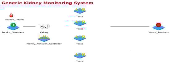 Figure 2 shows the generic kidney monitoring system model designed using the JaamSim simulator. In this simulation-model, inputs to the kidney are artificially planned with random kidney controlling functions. Additionally, a simulated environment of kidney function tests is designed which either collects samples from the kidney (considered as the human body part) or from urine. Input to imaging tests and biopsy are randomly provided through the kidney controller. Presently, the simulator model is not mapped to real data for experimental comparisons but this model considers random inputs and gives unpredictable outputs. This way of experimentation is performed to have unknown cases and their remedies.