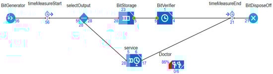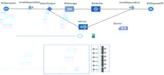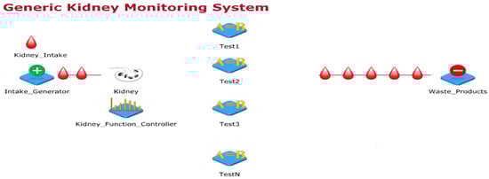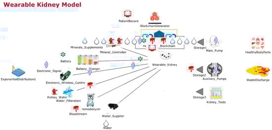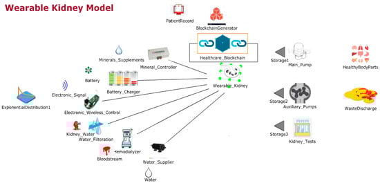 Figure 3 shows the JaamSim model for wearable kidneys with blockchain technology. The wearable kidney monitoring system model is different from the generic kidney model in many terms. In real-scenarios, it has been observed that kidney dialysis processes are very expensive and not very successful for quality of life [,].