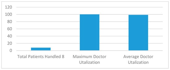 Figure 34 shows the statistical graphs computing total patient handled, maximum doctor utilization, and average doctor utilization. These statistics are dynamic i.e., variable with simulation time. Figure 34 shows one view after 3 s. At this time there are eight patients handled by 6 doctors with 100% doctor utilization (i.e., all are available and working) and average doctor utilization is 98.62%. Average doctor utilization is less than 100% because of the doctor’s other activities (excluding patient handling). All the timing parameters in the system are scaled down to 1/100th for fast execution.