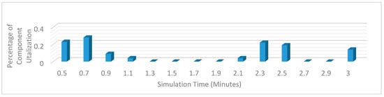Figure 36 shows the system working distribution variation with simulation time. System working distribution is defined as the variation presenting the percentage of component utilization over simulation time. Like Figure 34, Figure 35 and Figure 36 is also dynamic i.e., its values are continuous changes with simulation time. Figure 36 shows one screenshot during the initial 3 s. Results show that the maximum utilization of around 28.5% between 1 and 1.5 s.