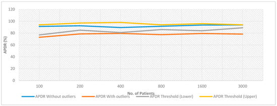 Figure 40 shows the Average Packet Delivery Rate (APDR) with an increase in patients in the proposed IoT-Sensor-based healthcare system. These patients are generic kidney patients and the performance of the network is analyzed for data storage and accessibility. Here, APDR is defined as the ratio of packets successfully received to the destination divided by a packet sent by a source for medical record storage or accessibility. Results show that the observed ADPR (without outliers) lies between upper and lower acceptable limits. These upper and lower acceptable limits are decided based on maximum and minimum data required (for storage and accessibility) for generic patients respectively. The observed APDR lies between 95% (approx.) to 97% (approx.). Thus, the proposed IoT-sensor-based framework is considered to be efficient in performance. ADPR (with outlier) lies below threshold limits. These outliers are considered to be present in the network for data breaches. These outlier activities increase the number of packets in the network and lower the performance of patient data storage or accessibility. Thus, overall network performance decreases. As the ADPR percentage decreases below the lower acceptable range, the network is considered under attack. Thus, the security level can be increased with an increase in the number of bits matching for consensus building.