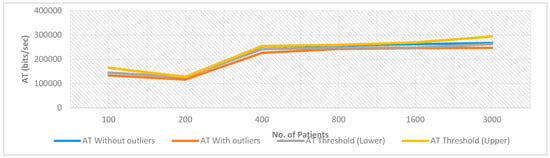 Figure 41 shows the average throughput (AT) variations with an increase in the number of patients. AT is defined as the average value of total payload (bits) successfully delivered to the destination node divided by simulation time in the network. Results show that the AT (without outlier) is lying between upper and lower acceptable limits. Further, AT (with outliers) is below the lower threshold limit. This indicates that attackers (with data breach) activities can lower the network performance and can be identified easily. The lower and upper AT values lie between 120 Kbps to 250 Kbps, approximately, whereas the lower and upper limits under ideal conditions are between 110 Kbps to 290 Kbps, approximately.