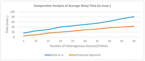 The results show that the delay in consensus building with different entities or devices in the network is lesser for the proposed approach as compared to the encryption/decryption-based approach used in Saia et al. []. This delay constantly increases with an increase in the number of devices. This experimentation is considered for 50 devices. However, the trends in results show that the delay gap increases. Thus, the proposed approach is much better compared tothe existing approach for small devices based networks to large device networks.
