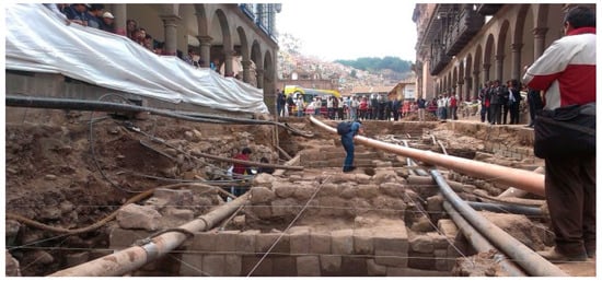 The idea of the project was born after a fortuitous discovery of Inca-era wall structures during the excavation made for subservice maintenance. Along the roads leading to Plaza de Armas in 2014 (Figure 1), these excavations unearthed walls of thickness range from 50 to 90 cm. They are composed of finely dressed granite blocks (typical of Inca ashlar masonry), are laid in both regular and irregular courses with an internal core of rubble masonry, and are composed of uneven stones set in mortar. In spite of the building features of the walls attributable to the Inca period, however, the excavations also brought to light pre-Inca ceramic fragments [11]. Finally, the excavation put also in evidence underground services (pipes of the aqueduct and sewerage), with most of them above the head of the walls (Figure 1) and others intrusive in nature, crossing the walls.