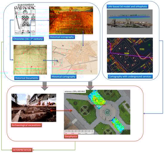 Considering that the GPR is the only geophysical method applicable in Cusco, the interpretation was made using (i) comparative observation of GPR time-slice amplitude maps with radargrams, appropriately geo-referenced on digital cartography along with (ii) the integration of GPR outputs with ancillary datasets made up of an urban map with underground services and information provided by the historical data sources and archaeological records (Figure 2).