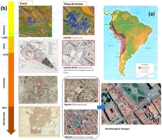 (a) Cusco capital of Inca Empire; (b) historical development of Cusco and Plaza de Armas; (c) detail of Plaza de Armas with indication of some morphological changes of the main square from the Colonial to Republican era.