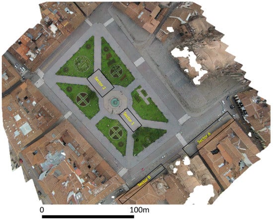 The urban maps have been integrated by a more detailed orthophoto of Plaza de Armas obtained by processing RGB images taken from drone using structure from motion, as shown in Figure 4.