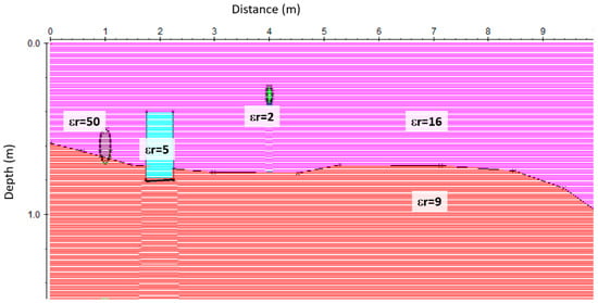 The data were subsequently processed using standard two-dimensional processing techniques by means of the GPR-Slice Version 7.0 software [18]. The processing flow-chart consists of the following steps: (i) Frequency filtering. (ii) Manual gain, to adjust the acquisition gain function and enhance the visibility of deeper anomalies. (iii) Customized background removal to attenuate the horizontal banding in the deeper part of the sections (ringing), performed by subtracting in different time ranges a ‘local’ average noise trace estimated from suitably selected time–distance windows with low signal content (this local subtraction procedure was necessary to avoid artefacts created by the classic subtraction of a ‘global’ average trace estimated from the entire section, due to the presence of zones with a very strong signal). (iv) Estimation of the 2D electromagnetic wave velocity. EM wave velocity was determined from the reflection profiles acquired in continuous mode, using the characteristic hyperbolic shape of reflection from a point source [19]. This is a very common method of velocity estimation and it is based on the phenomenon that a small object reflects EM waves in almost every direction. (v) 2D Kirchhoff migration. (vi) Depth axis conversion using a constant average velocity value of 0.07 m/ns. The migrated data were subsequently merged together into three-dimensional volumes and visualized in various ways in order to enhance the spatial correlations of anomalies of interest. In order to understand the nature of the EM wave reflection from an archaeological structure and a pipe, a 2D model was produced using the reflex software [20]. This program allows the user to generate a synthetic model of what might be expected using known properties of the ground and the geometry of underground features [20]. A model of a stratified subsoil with the presence of pipes and walls was assumed, as shown in Figure 5. Two homogeneous layers with a dielectric constant of 16 and 9 were modelled for the surface terrain and more compact layer, respectively. In the terrain, two pipes with different dielectric constant were inserted. The first one simulated a water-filled pipe (εr = 50), and the second a metal cable-filled pipe (εr = 2). A wall feature, with a dielectric constant of 5, was placed at the contact between the two modelled layers.