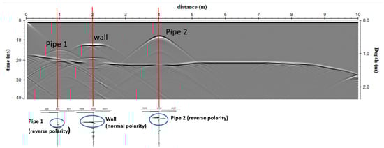 The synthetic reflections (Figure 6) demonstrated that the pipes generate reflections when energy is intersected in the same pipe space, as was expected. Other reflection events were generated at the contact between soil 1 and 2 and from the simulated wall. When radar energy is reflected from a buried interface where the EM wave velocity decreases, the polarity of the reflected wave will be the same as the direct wave generated from the transmitting antenna [16,21]. This is the normal case in most ground conditions, and therefore, most reflections are recorded as normally polarized sine waves. Usually, as radar energy moves deeper into the ground, moisture retention increases and EM wave velocity decreases. If a drastic increase in velocity occurs at a boundary, for example, when waves enter a pipe space, a reflection will be generated that is visible in traces as a reversed polarity sine wave [16,21].