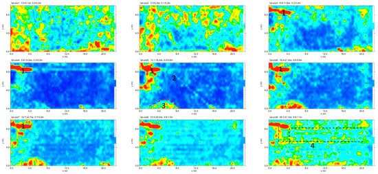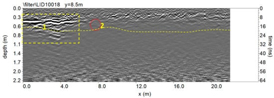 In the slices ranging from 0.2 to 1.1 m in depth, relatively high-amplitude alignments are clearly visible as the anomalies evidenced in the radargram (Figure 7). In the time slices in Figure 8 ranging from 0.5 to 0.6 m in depth, the weak oblique alignment (labelled 2) seems to show a probable pipe. The deeper slices (0.5–1.1 m) show other high amplitude alignments (labelled 3).