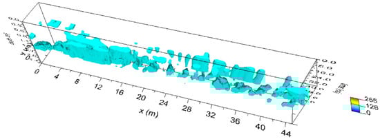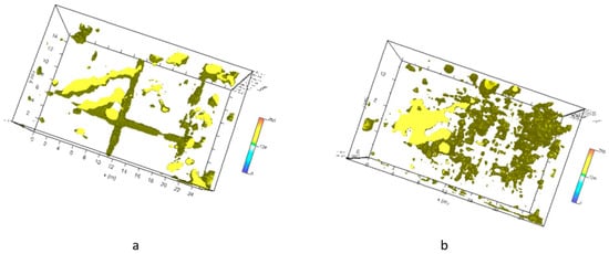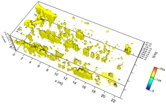 Moreover, the highest amplitudes were rendered into an isosurface [21,24,25]. Three-dimensional amplitude isosurface rendering displays amplitudes of equal value in the GPR study volume. Shading is usually used to illuminate these surfaces, giving the appearance of real archaeological structures. In this case, the threshold calibration is a very delicate task in order to obtain useful results. Figure 9 shows the three-dimensional amplitude isosurface using the 54% threshold.