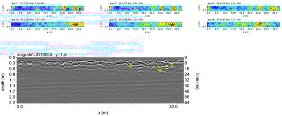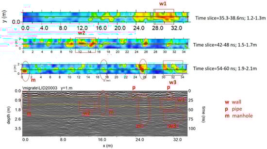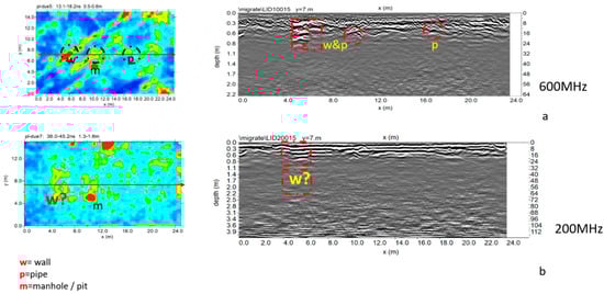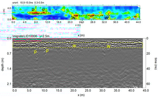 Figure 14 and Figure 15 show the trace reflections and time slice for 600 MHz and 200 MHz antenna, respectively. The radargrams show at least three continuous reflectors which could be related to three different building phases and human frequentation. The shallowest is 50–60 cm deep, associated with two pipes (indicated as p in Figure 14 and Figure 15). The intermediate reflector is around 1.50 deep, related to a layer which includes two local reflectors (w1 and w2) which are considered to be walls. Finally, the deeper one is around 1.9–2.1 m deep, and is related to the oldest layer which includes a local reflector named w3, which is also considered to be a wall. Finally, the radargrams show repeated reflectors considered to be manholes (named ‘m’ in Figure 15).