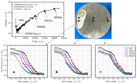 The results of a corrosion test in 1/100 ASW are shown in Figure 2. The temporal change of the corrosion current and the I–V curves at different positions are presented together with an optical photograph of the corroded surface after the corrosion test. Point a is located within the corroded area; point b is the center of the specimen, and point c is near the right edge of the specimen. Timestamps of 145, 1162, 20,026, 30,031, and 40,036 s are indicated on the curve of the corrosion current, and the I–V curves acquired at these points of time are shown below.