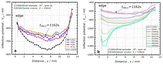 In Figure 3a, the spatial distribution of Vinf has a valley shape. Vinf decreases as the measurement point goes further from the edge of the specimen and reaches a minimum at approximately the center of the specimen. With increasing time during the potentiostatic test, this valley becomes shallower until the occurrence of corrosion at tINCU. The effective bias applied to the EIS (electrolyte–insulator–semiconductor) structure of a LAPS is the total of the externally applied bias (Vb), the change of the Nernst potential sensitive to pH, and the IR drop owing to the DC current flowing out of the crevice. As the pH remains the same, the shift of the I–V curve is a direct measure of the IR drop. The pH change remains negligible at the early stage before tINCU; therefore, the spatial distribution of Vinf should be attributed to the potential distribution owing to the IR drop. As the corrosion current decreased until tINCU, the IR drop became smaller, and the valley became shallower.