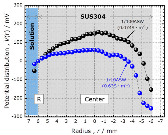 Figure 4 shows that the value of the V(r) at the center was 149 mV and 60 mV for 1/100 ASW and 1/10 ASW, respectively. When the specimen was biased at E = +150 mV vs. Ag/AgCl(3M NaCl) reference electrode, the effective polarization voltage at the center of the specimen was estimated to be +1 and +90 mV, respectively. Considering that the spontaneous potential of SUS304 at the start of the potentiostatic test was approximately −200 mV, polarization at +1 and +90 mV was still in the anodic region. Therefore, the entire surface of SUS304 in the crevice was anodically polarized.