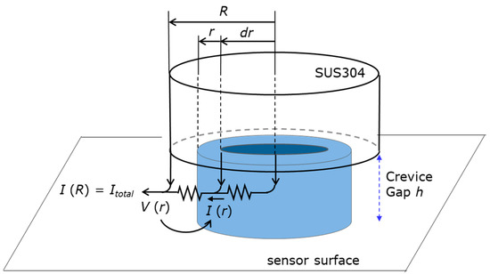 We assumed a uniform crevice gap h and considered a hollow cylinder in the crevice with radius r, thickness dr, and height h, as shown in Figure 5. When the specific conductivity of the solution in the crevice is σ, the resistance between the inner and outer walls of the cylinder filled by the solution is expressed as:
