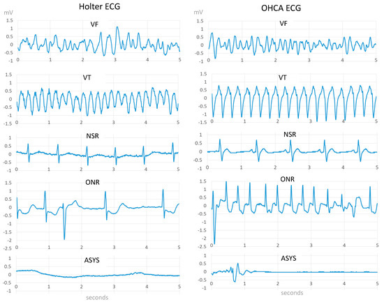 Examples of 5 s electrocardiogram (ECG) strips, extracted according to the defined annotation scheme for shockable (ventricular fibrillation—VF, rapid ventricular tachycardia—VT) and nonshockable (normal sinus rhythms—NSR, other nonshockable rhythms—ONR, asystole—ASYS) rhythms, found in Holter (left panel) and out-of-hospital cardiac arrests (OHCA) (right panel) databases.
