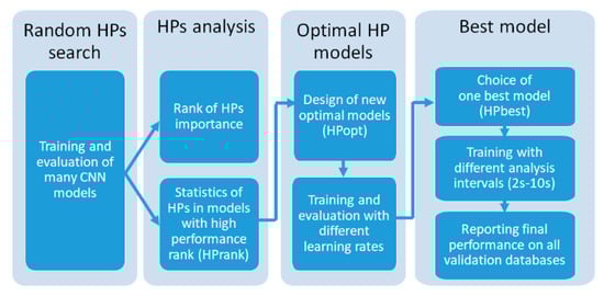 We hypothesize that determining the number of trainable parameters (Equation (2)) might have significant influence on the Sh/NSh rhythm detection performance. Therefore, we performed a process of search, analysis and optimization of the top-ranked HP settings with the final aim to justify the choice of the best CNN model. The whole process is schematically summarized in Figure 3 and will be further described in detail.