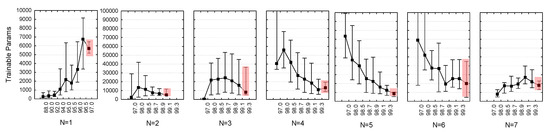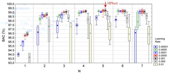 For different CNN depths N = {1, 2, 3, 4, 5, 6, 7}, the distributions (median values) were used to design new statistically justified “median HP” models which were expected to perform equally well to the top-ranked models. We further denoted them as our optimal CNN configurations, valid for different N: