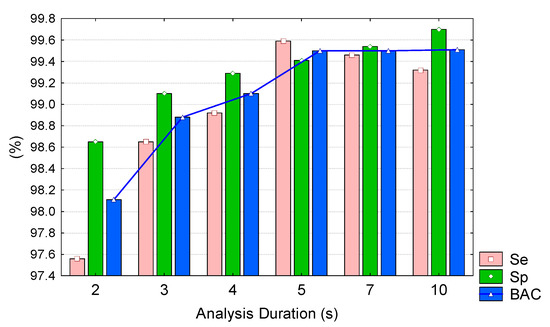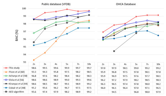 - The application of the model on ECG signals with short and long durations (2–10 s), with maximal performance for 5 s analysis (BAC = 99.5%, Se = 99.6%, Sp = 99.4%, Table 4) and tolerable drop in performance (<2% points) for very short 2 s analysis (BAC = 98.2%, Se = 97.6%, Sp = 98.7%, Table 4) can satisfy the crucial AED requirements for providing shock advisory decision with minimal hands-off delay after end of chest compressions.