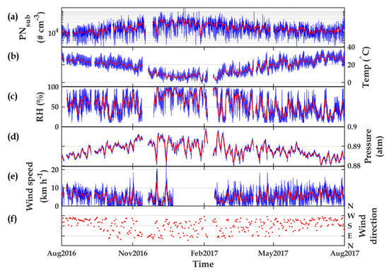 Figure 1b–f present the meteorological conditions during the experiment. The red and blue curves indicate daily and hourly averaged data. Figure 1b shows the temperature (T), with a minimum peak of about 0 C during winter and a maximum of about 40 C during summer with the hourly median value of 19.9 C. Figure 1c indicates the relative humidity (RH), which varied between 10% and 100% with the hourly median value of 52.3%. Figure 1d is the pressure (P), which ranged between 0.88 atm and 0.9 atm, and its median value was 0.888 atm. Figure 1e indicates wind speed (WS), ranging between 0 km/h and 20 km/h with a median value of 5 km/h. It can be seen that there were about 2 months of missing data in this variable. Finally, Figure 1f represents wind direction (WD), where only daily averaged data are shown for better visualization. Wind blows mainly from the south and west (180–270) from June to September. The wind direction varies in other months, ranging from 45 to 270.