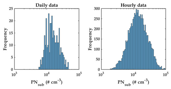 PN number concentration histograms during the experiments for daily averaged data (left) and hourly averaged data (right).