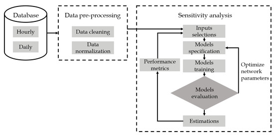 This section describes the methodology for estimating PN concentration used in this study. Figure 3 shows a block diagram illustrating this methodology. First, a database was formed using processed data from aerosol and meteorological measurements as described in Section 2.2. In the second step, the data underwent pre-processing procedures through data cleaning and data normalization, which will be explained in Section 3.1. The next step was a part of the sensitivity analysis block, consisting of several sub-steps.