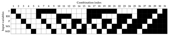 We resorted to two different types of ANN, called FFNN and TDNN, with the model specifications mentioned in Section 3. These models were then tested on all combination indexes of measured meteorological variables to perform sensitivity analysis, as illustrated in Figure 4. The models were trained and tested twice using daily and hourly average data. In this way, several best combinations of meteorological variables could be evaluated, and then, the best combination would be selected to be used as the inputs of PN models. The number of combinations of the variables used was 5 (if one variable was used), 10 (if two variables were used), 10 (if three variables were used), 5 (if four were variables used), and 1 (if five variables were used), with the total combinations being 31.