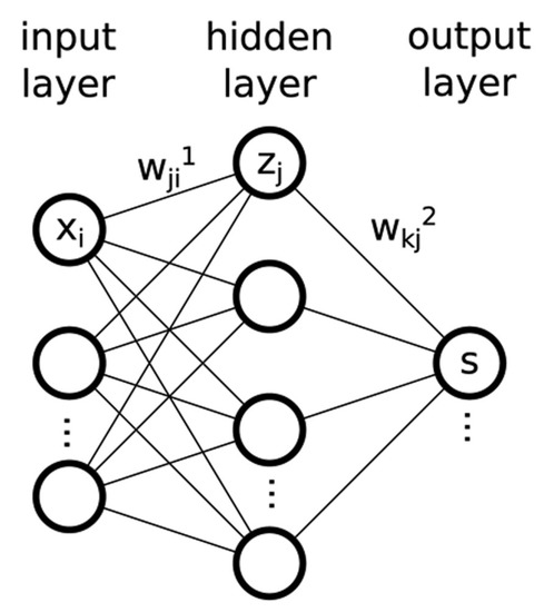 Both FFNN and TDNN estimate PN concentration, , through the function of meteorological variables, , by optimizing the weights, , of NN. Figure 5 displays a schematic representation of a neural network with one hidden layer. The jth neuron in the Lth layer calculates the output as: