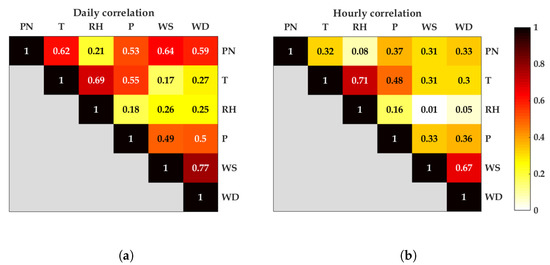 Matrix plots: absolute Pearson correlation coefficients between measured variables for daily and hourly averaged data. (a) Daily. (b) Hourly.
