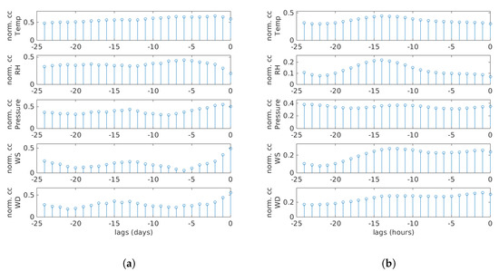 Cross-correlation between PN data and meteorological parameters for daily and hourly averaged data. Different time lags are shown on the x-axis, whereas the y-axis represents normalized correlation coefficients (norm. cc). (a) Daily. (b) Hourly.