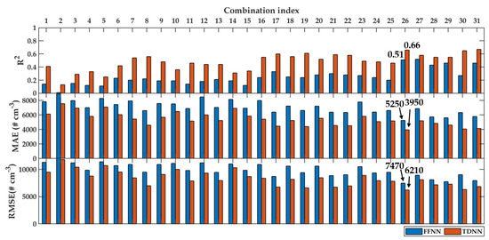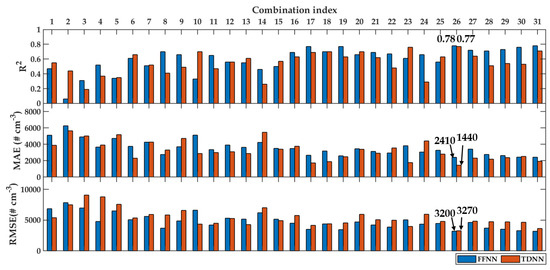 The performance metrics of modeling using these input variable combinations were tested according to R, MAE, and RMSE. Figure 8 and Figure 9 present the performance metrics of PN modeling for daily and hourly averaged data, respectively. The blue bars are FFNN, whereas the red bars are TDNN. The low values of MAE and RMSE indicated that the models’ performance was better than the high values of these metrics. On the other hand, the high R values indicated that the models’ performance was better than the lower values. Since there were three metrics involved, the first priority was given to R, then MAE and RMSE.