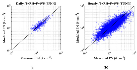 Scatter plot between PN measurement and PN estimation using four measured meteorological variables (T, RH, P, and WS). (a) Daily. (b) Hourly.