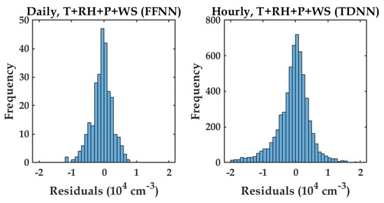 Figure 10 shows the scatter plots between the reference measured PN and the modeled PN using variables T, RH, P, and WS, for daily (Figure 10a) and hourly (Figure 10b) averaged data. It can be seen that most estimated data points of PN concentration for both averaged data followed the 1:1 line. Figure 11 shows the histograms of residual error between the PN measurement and the PN model for daily (left) and hourly (right). The figure shows that the majority of residual data points lied around zero residual error. This indicated that most of the estimated PN data points were precise.