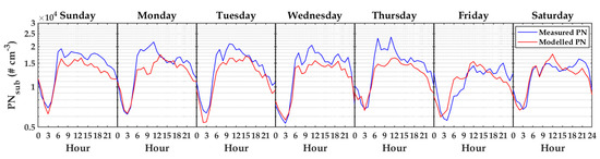 Figure 12 presents the median of diurnal cycles calculated on all days in a week for measured PN (blue) and modeled PN (red). Furthermore, Figure 13 shows the median of diurnal cycles calculated on workdays and weekends for measured PN (blue) and modeled PN (red). Both figures show that the PN model followed the patterns of diurnal cycles in these two scenarios well. The results emphasized that PN modeling, using TDNN with input variables of T, RH, P, and WS, was reliable. Even though the variable RH presented a weak correlation to PN as shown in Figure 6a,b, through sensitivity analysis, it was found that it became a good feature when combined together with other variables. This indicated that using bivariate correlation analysis may not be optimal to find the best combination of variables to estimate PN concentration. Therefore, sensitivity analysis was a suitable method in this case.